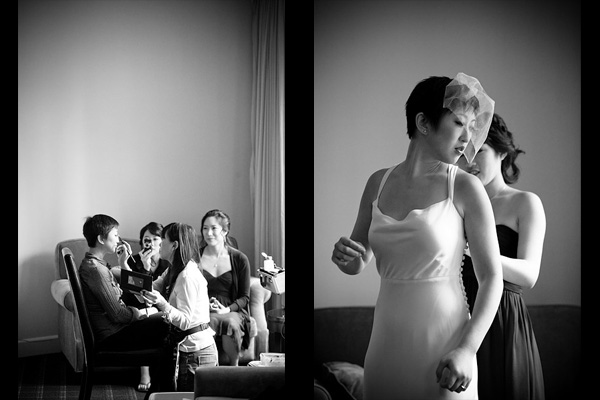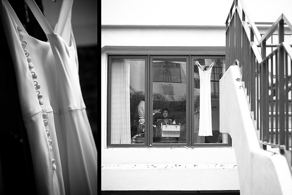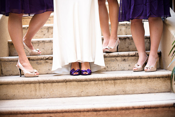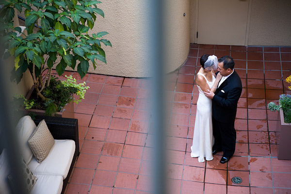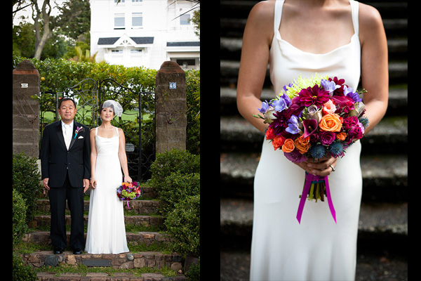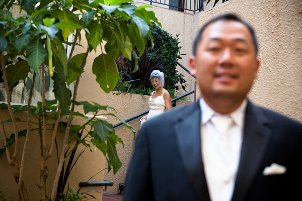 Debora grew up in the the East Bay; Terry is originally from Cerritos near LA. Loving the San Francisco area they chose Sausalito to be “The Location”. On the morning of the wedding people assembled at the landmark Casa Madrona Hotel and Spa. Surrounded by her family and bridesmaids, Debora dressed in a room with a view of the inner courtyard. As Vivi was putting the finishing touches on Debora’s hair and makeup, Terry and the guys returned from breakfast and went straight to their room to get changed. Terry chose a traditional tuxedo and Debora slipped into a beautifully simple J.Crew sheath dress with button detailing along the side completing the ensemble with purple heels 🙂
